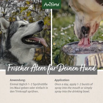 Da wir natĂĽrliche Inhaltsstoffe aus Pflanzenextrakten nutzen, eignet sich das Dentalspray fĂĽr Hunde, die nicht alles vertragen. Das AniForte Denta Clean & Care Dentalspray ist die flĂĽssige ZahnbĂĽrste fĂĽr Hunde – noch nie war Mundhygiene einfacher! Einmal täglich 1 – 2 SprĂĽhstöße ins Maul oder ins Trinkwasser geben.