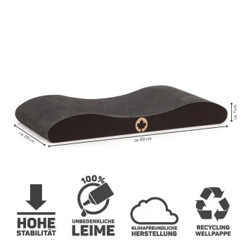 In der einzigartigen BLACK EDITION ist diese Kratzwelle ein ganz besonderer Eye-Catcher! Die Kratpappe ist dabei mit unbedenklicher Lebensmittelfarbe komplett durchgefärbt. Das CanadianCat-Logo schimmert in der BLACK EDITION in einem glänzendem Roségold.