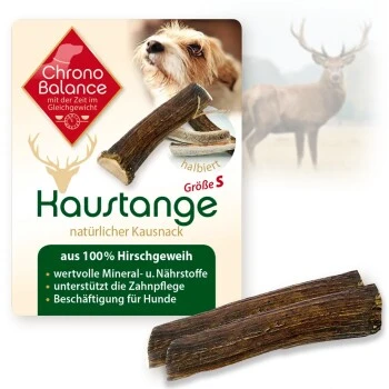 Die ChronoBalance Kaustangen aus 100% Hirschgeweih werden ausschließlich aus abgeworfenen Hirschgeweihen gefertigt – niemals von Schlachttieren. Rot- und Damhirsche sowie Rehböcke werfen ihr Geweih einmal im Jahr auf natürliche Weise ab. Die aus dem Wald von Hand gesammelten Geweihstangen werden halbiert, abgeschliffen und in die richtigen Größen zurechtgeschnitten, um einen hochwertigen Kauknochen für kleine und große Hunde zu garantieren. Durch die Halbierung kann das Innere der Geweihstange und damit die wertvollen Mineral- und Nährstoffe heraus gekaut werden.