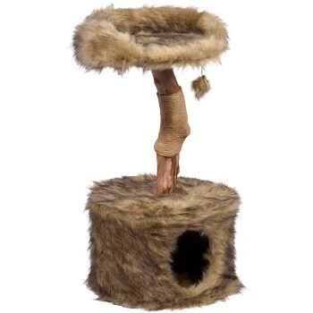 Dieser Design-Kratzbaum hebt sich von Standardmodellen vor allem durch die Verwendung eines hochwertigen Naturholzstammes ab. Dieser Kratzstamm sieht nicht nur toll aus, sondern bietet Ihrem Liebling ein naturnahes und bestĂ€ndiges KratzgefĂŒhl. Jeder Stamm ist durch seine Wuchsform unterschiedlich und ein Unikat. Stellenweise ist er mit Jute umgeben, um eine optimale Krallenpflege zu unterstĂŒtzen und die Dauerhaftigkeit des Kratzbaums weiter zu erhöhen. Die flauschige LiegeflĂ€che bietet Platz zum Schlafen und Relaxen und ist eine willkommene Klettermöglichkeit. Die integrierte Katzenhöhle ist zudem ein sicherer RĂŒckzugsort und eine Oase der GemĂŒtlichkeit. DarĂŒber hinaus lĂ€d der Spielball Ihren Stubentiger zum Herumtoben ein. Die Holzbestandteile sind FSCÂź-zertifiziert, wodurch eine nachhaltige und umweltfreundliche Forstwirtschaft garantiert wird. Die Bodenplatte hat einen Durchmesser von ca. 45 cm, wobei der Kratzbaum ca. 78-88 cm hoch ist und etwa 7,2 kg wiegt.
