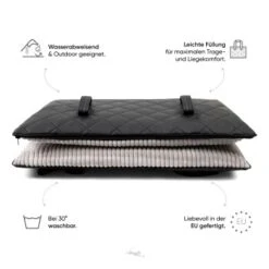 Die modische Reisematte von dem Hamburger Label “Freudentier” kommt in edlem, gestepptem, Kunstleder daher. Öffnet man die Reisematte, entfaltet sich ein wahres Kuschelparadies. Das Innere der Matte ist mit einem leichten Kissen gefüttert, für die Liegefläche wurde ein sehr weicher und super komfortabler Stoff verwendet. Übrigens: Die Outdoor Hundematte kann ganz bequem bei 30 Grad gewaschen werden.