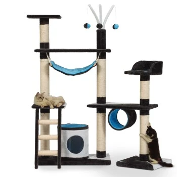Eine integrierte Leiter sorgt für höchsten Kletterspaß und ermöglicht selbst älteren oder kranken Katzen einen leichten Auf- und Abstieg. Ein weiteres besonderes Highlight ist die Angel mit Plüschbällen auf der obersten Plattform, die den Spieltrieb Ihrer Katze fördert. Für eine optimale Krallenpflege ist ebenfalls bestens gesorgt, denn die mit Natursisal umwickelten Säulen unterstützen den natürlichen Kratztrieb. Durch das moderne und unauffällige Design lässt sich dieser Kratzbaum in jede Wohnumgebung integrieren.