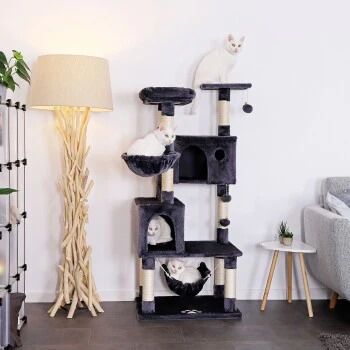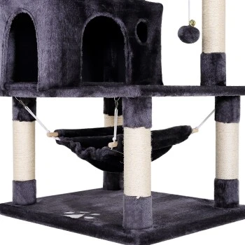 - IDEALES SPIEL- UND RUHEPARADIES. Die vortreffliche Ausstattung dieses Katzenbaumes mit 2 Höhlen und Plüschbällen mit Glocken befriedigt den Spieltrieb Ihrer Katze. Das gemütliche Liegebett, die Liegemulde und die bequeme Hängematte unterstützen zusätzlich die benötigten Ruhephasen und auch das beliebte Beobachten kommt auf der Aussichtsplattform nicht zu kurz. Die perfekte Balance zwischen Spielspaß und Rückzugsmöglichkeiten.