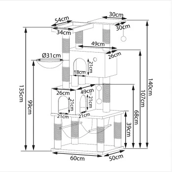 - MAßE UND FARBEN. Dieses hochwertige Katzenzubehör verfügt über die Maße 50 x 60 x 140 cm, die Höhlen über 48 x 25 x 28 cm und das Plateau 41 x 30 x 8 cm. Das langlebige Spielzeug ist in den Farben Hellgrau und Dunkelgrau erhältlich.