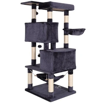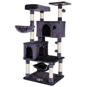 Mit diesem Katzenspielhaus aus weichem Plüsch bleiben keine Wünsche Ihrer Samtpfote offen. Die kuscheligen Höhlen und die Hängematte laden zum Ausruhen und Verstecken ein und die hängenden Plüschbälle sorgen für den nötigen Spielspaß. Das einladende Liegebett und die Liegemulde sind ideal für die Ruhezeiten und das Beobachten der Umgebung, ebenso wie die einladende Aussichtsplattform. Die Stämme aus robustem Sisal unterstützen die Krallenpflege und halten Ihre Katze somit von den Möbeln fern. Sie können diese beachtliche Kratzsäule überall aufstellen und für einen echten Blickfang mit den ansprechenden Farben Hellgrau oder Dunkelgrau sorgen. Die Aufbauanleitung ist leicht verständlich und wird zusammen mit dem dementsprechenden Schraubenset mitgeliefert.