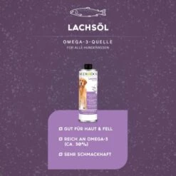 Das Medidog Lachsöl ist für alle Hunde geeignet. Es fördert ein samtig strahlendes Fell, eine vitale Haut und unterstützt bei der Abdeckung des Omega-3-Fettsäurenhaushaltes. Da der Organismus der Tiere selbst nicht die hochwertigen Fettsäuren bilden kann, müssen sie über die Nahrung aufgenommen werden.