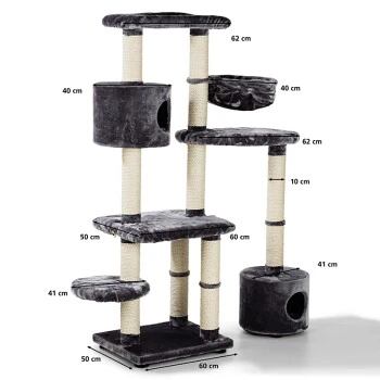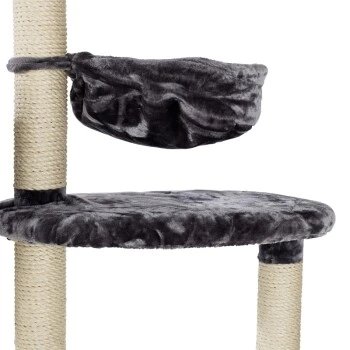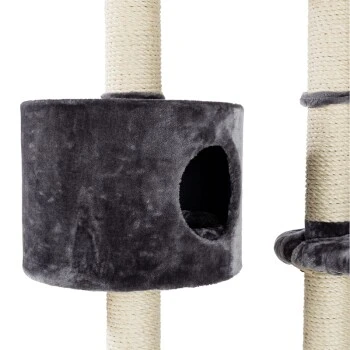 Drei große Liegeflächen, mit hochwertigen Bezügen ausgestattet, laden zum Verweilen auf unterschiedlichen Ebenen ein. Für gemütliches Dösen bietet sich auch die Hängematte und das Bettchen an. Zum Verstecken und Zurückziehen warten zwei geräumige Höhlen.