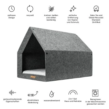 Der Bezug ist beständig gegen Tierschweiß und -speichel aber auch gegen Zerkratzen. Für die richtige Hygiene ist ebenfalls gesorgt: Dieses Hundehütte indoor/Katzenhaus lässt sich ganz einfach von Fell und Schmutz reinigen.