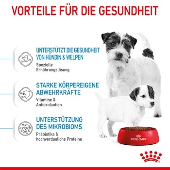 Warum ein besonderes Futter für trächtige kleine Hündinnen und junge Welpen? Aus ernährungswissenschaftlicher Sicht ist es sehr wichtig, dass kleinrassige Hündinnen und ihre neugeborenen Welpen Nahrung erhalten, die genau auf ihre speziellen Ernährungsbedürfnisse abgestimmt ist. Deshalb bietet ROYAL CANIN© Mini Starter Mother & Babydog alles, was trächtige Hunde mit einem Körpergewicht von bis zu 10 kg, sowie Welpen in der Entwöhnungsphase bis zum 2. Monat brauchen. ROYAL CANIN© Mini Starter Mother & Babydog unterstützt die Gesundheit von Hündin & Welpen. Es ist eine spezielle Ernährungslösung, die an den hohen Energiebedarf von Hündinnen am Ende der Trächtigkeit und während der Säugezeit für ein optimales Wachstum der Welpen angepasst ist. Außerdem wird wissenschaftlich nachgewiesenen die Entwicklung der körpereigenen Abwehrkräfte von Welpen durch einen Nährstoffkomplex mit Vitamin E und C unterstützt. ROYAL CANIN© Mini Starter dient zudem der Unterstützung des Mikrobioms durch eine Kombination aus Präbiotika (MOS) & hochverdaulichen Proteine zur Unterstützung einer ausgewogenen Darmflora und einer gesunden Verdauung. Die Kroketten lassen sich leicht bis zu einer breiartigen Konsistenz einweichen. Diese Konsistenz ist nicht nur für die Hündin sehr schmackhaft, sondern erleichtert den Welpen während der Entwöhnungsphase auch den Übergang von Muttermilch zu fester Nahrung. Mehr Abwechslung für Hundemutter und Welpen Um den individuellen Vorlieben verschiedener Hunde gerecht zu werden, ist ROYAL CANIN© Starter Mother & Babydog auch als in Form von besonder weicher Mousse erhältlich. Wenn Sie eine Mischfütterung Ihrer Hunde in Betracht ziehen, befolgen Sie einfach unsere Fütterungsrichtlinien, um sicherzustellen, dass Ihr Hund die richtige Menge an Nass- und Trockenfutter erhält. ROYAL CANIN© Qualitätsversprechen: Alle ROYAL CANIN Produkte durchlaufen eine umfassende Qualitätskontrolle, um eine optimale Futterqualität zu gewährleisten und den individuellen Ernährungsbedürfnissen sowie dem Lebensstil Ihres Hundes gerecht zu werden. Das bedeutet, mit ROYAL CANIN© Mini Starter Mother & Babydog bieten Sie Ihrem Hund und seinen Welpen eine hochwertige und ausgewogene Ernährung.