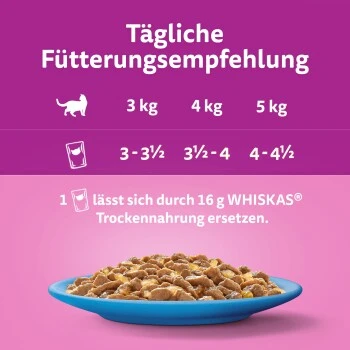 Hochwertiges Katzenfutter in Gelee fĂĽr Katzen ab 1 Jahr. Verwöhne deinen Liebling mit köstlichem Nassfutter mit Thunfisch und Lachs in der GroĂźpackung. Bereite deiner Katze eine Freude! Speziell zubereitet, um das natĂĽrlich Gute und Köstliche der hochwertigen Zutaten zu bewahren. Mit unseren Lieblingsmahlzeiten eilt deine Katze schneller als je zuvor zum Napf! Vom verspielten Kätzchen bis zur wunderbar älteren Katze enthalten unsere schmackhaften Rezepturen alles, was deine Katze fĂĽr ihr Alter braucht. Zubereitet fĂĽr zufriedenes Schurren … während der Mahlzeiten und darĂĽber hinaus.
